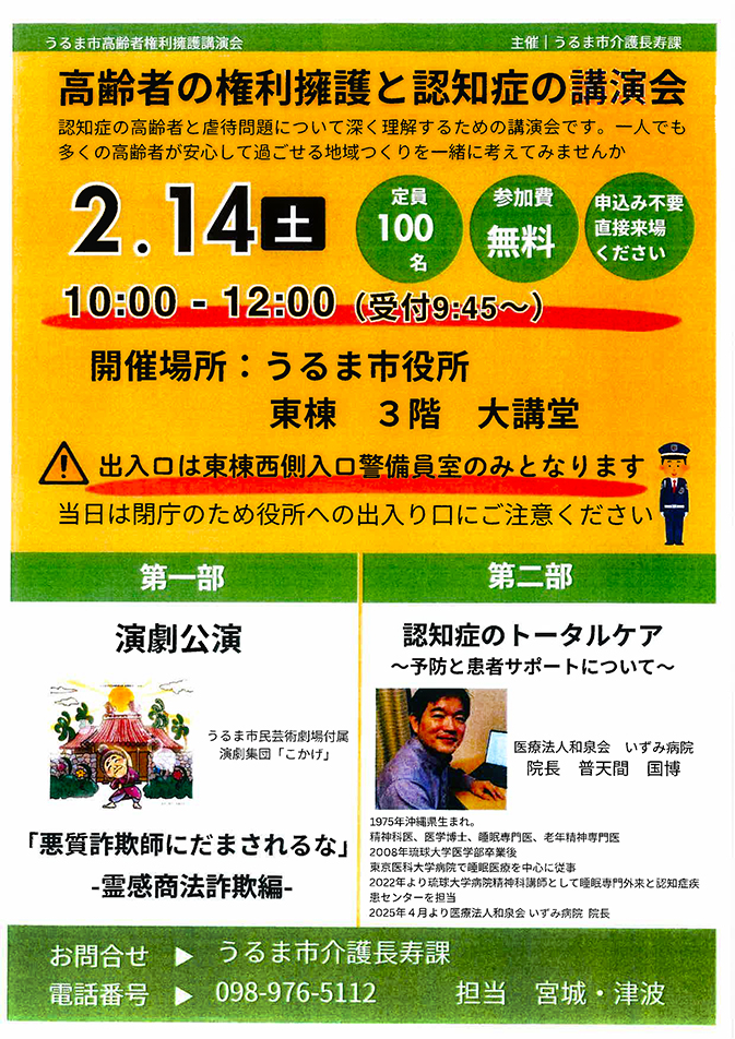 認知症の高齢者と虐待の問題について、認知症専門医である普天間院長がうるま市役所で講演会を行います。