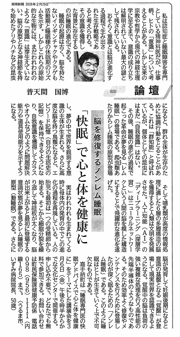 普天間院長の記事が琉球新報(2026.2.25)に掲載されました。